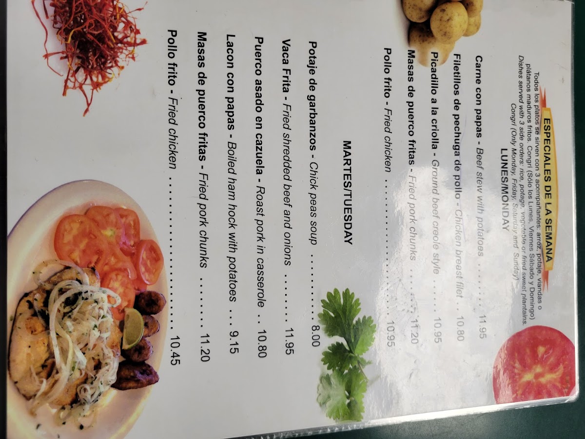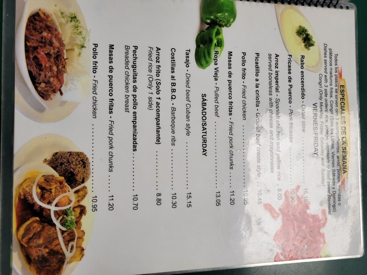 Main and Side Orders: Main items include rice dishes like Arroz Con Pollo a La Chorrera and Arroz Imperial, grilled fish and snapper, steak sandwiches, chicken wings, and Cuban classic dishes such as Cubanito and Sabor Cubano. Additional side orders include maduros (sweet plantains), various cheeses, fried potatoes, different styles of rice and purees, vegetables, and other starches like fufu de platano and viandas.