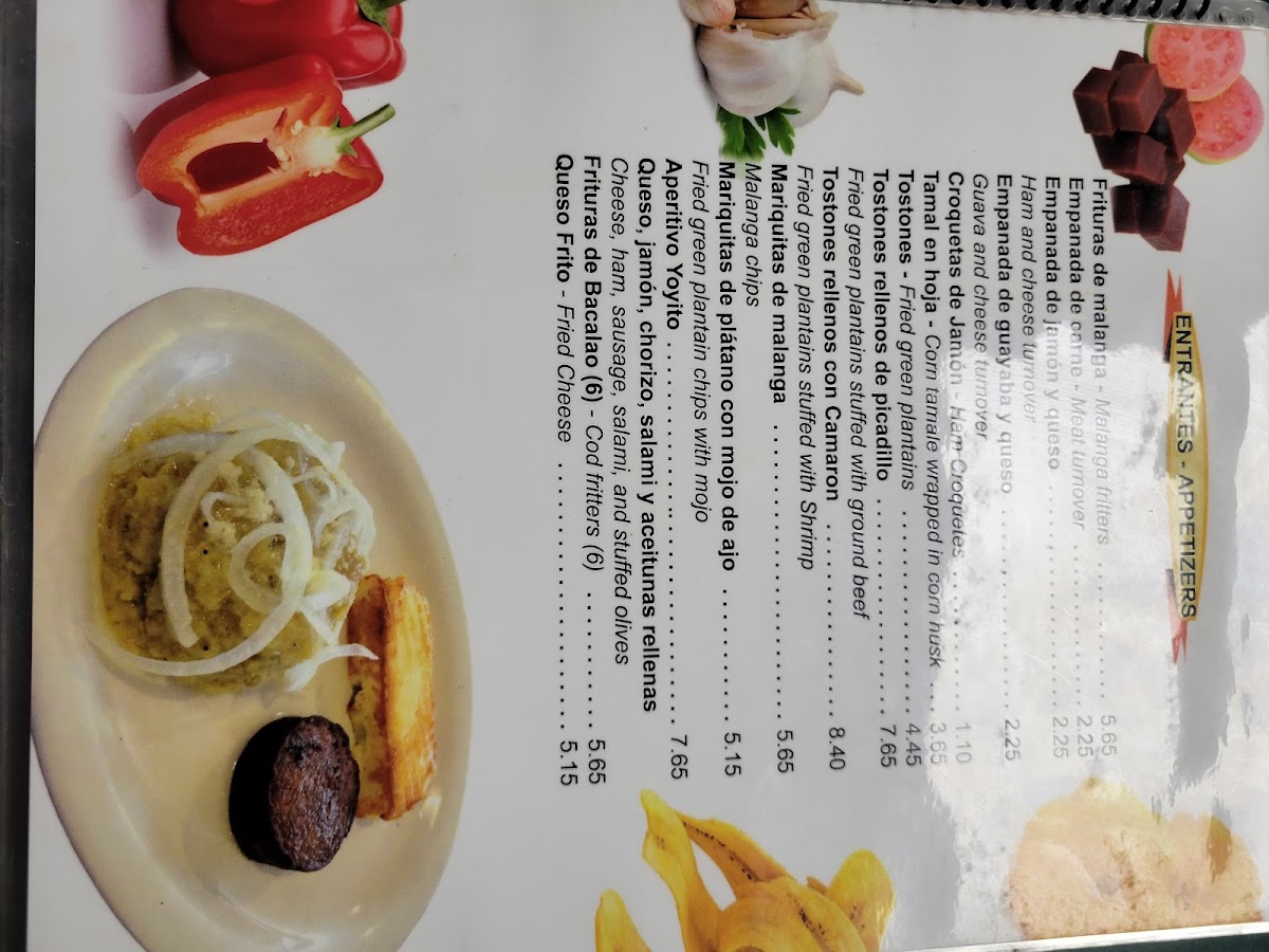 Entrantes (Appetizers): This section includes traditional starters such as malanga fritters, several types of empanadas (meat, ham & cheese, guava & cheese), croquetas (ham and codfish varieties), tamales, and tostones with options for picadillo or shrimp fillings.