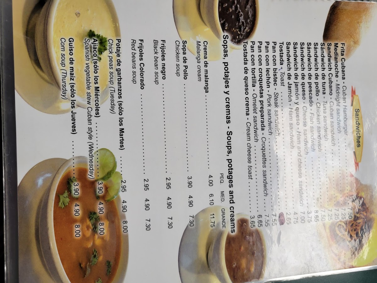 Drinks: The menu also includes beverages typical of a cafe, such as Cuban coffee, regular coffee, and fresh juices, complementing both light and more substantial meal options.